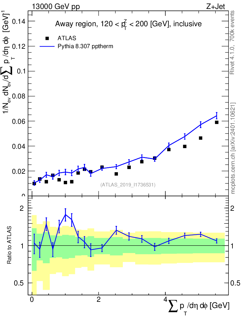 Lines: data, pythia8 8.307 pptherm |
