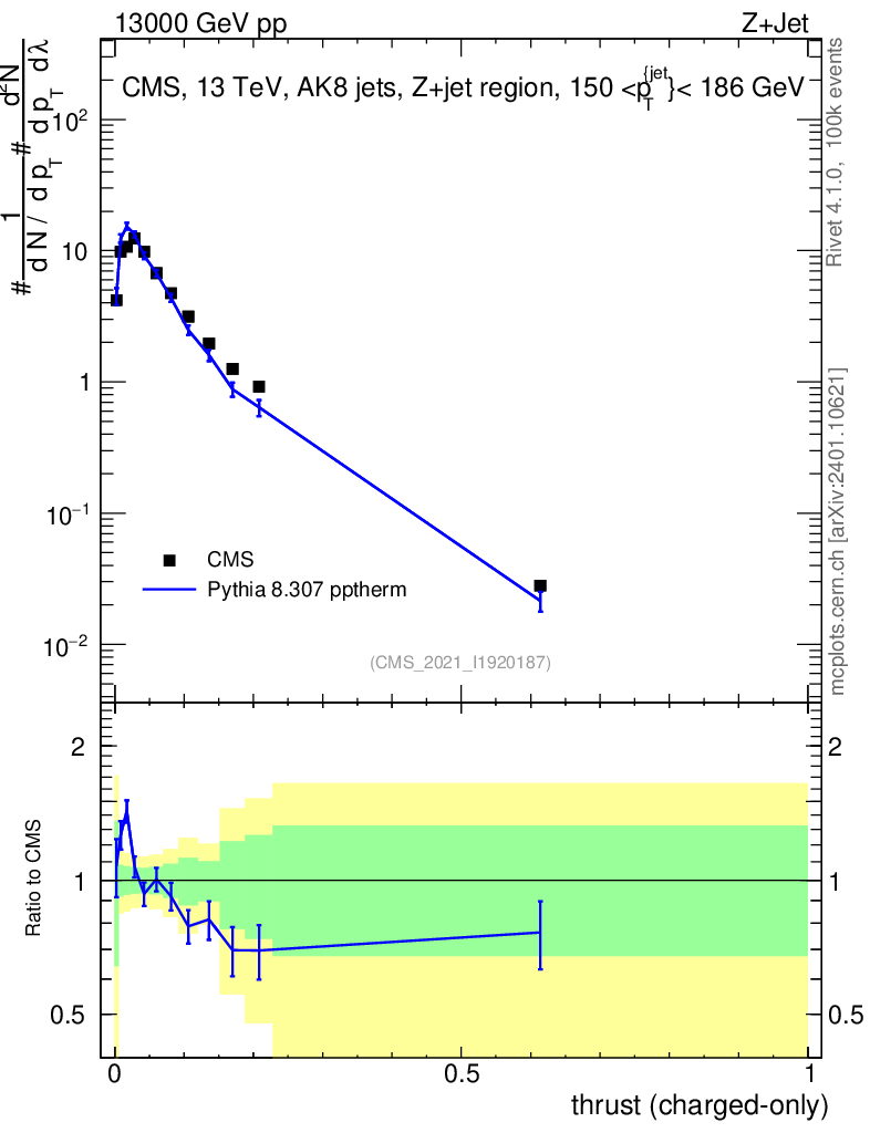 Lines: data, pythia8 8.307 pptherm |