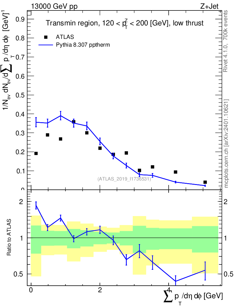 Lines: data, pythia8 8.307 pptherm |