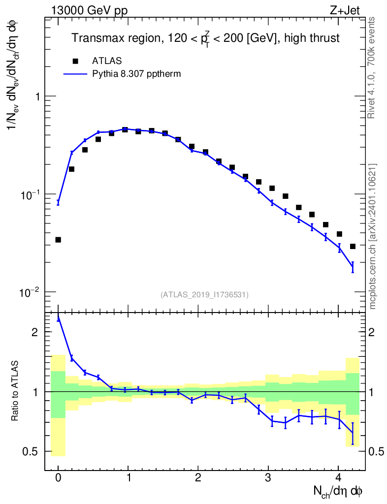 Lines: data, pythia8 8.307 pptherm |