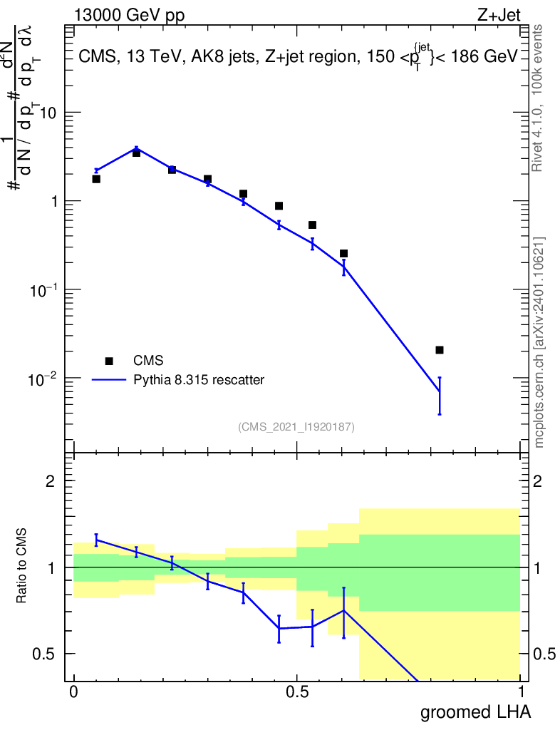 Lines: data, pythia8 8.315 rescatter |