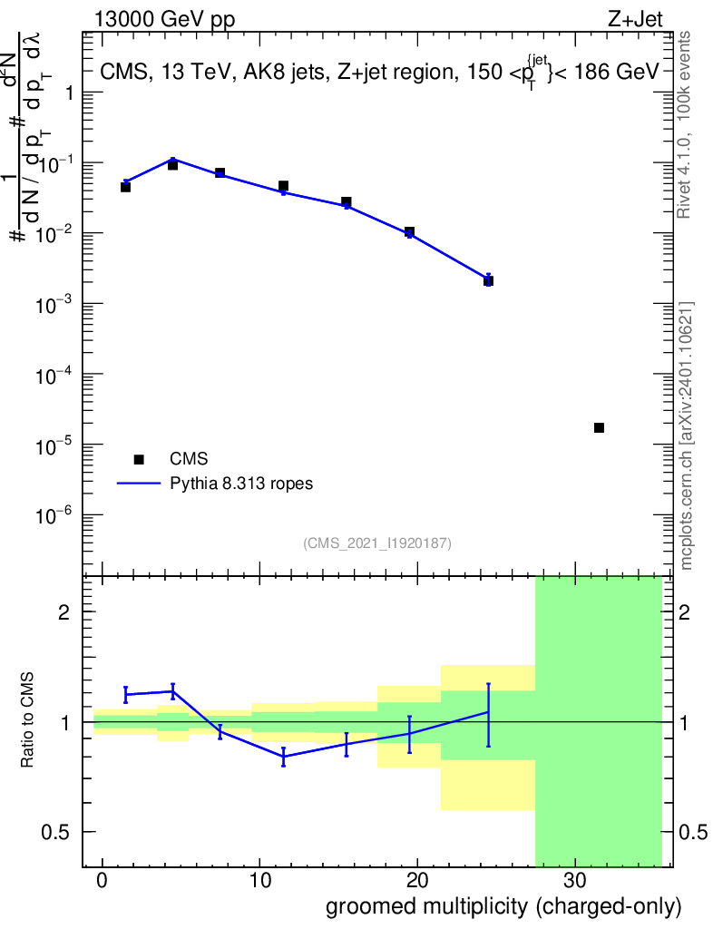Lines: data, pythia8 8.313 ropes |