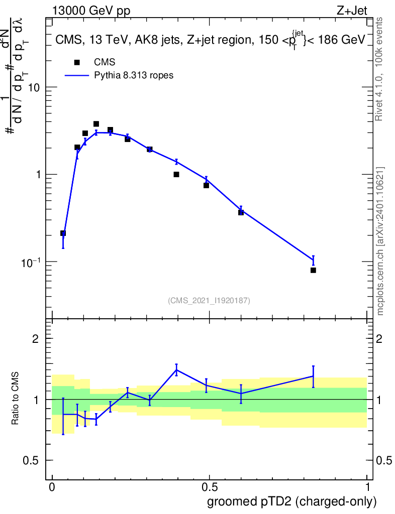 Lines: data, pythia8 8.313 ropes |