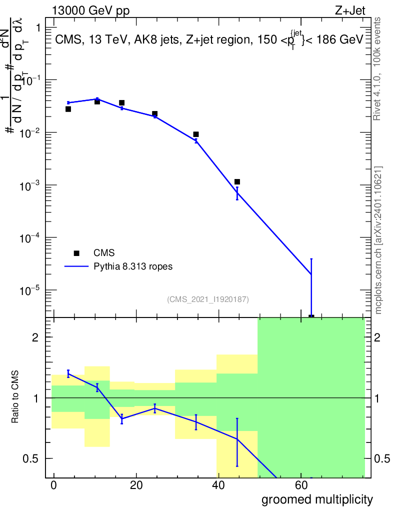 Lines: data, pythia8 8.313 ropes |
