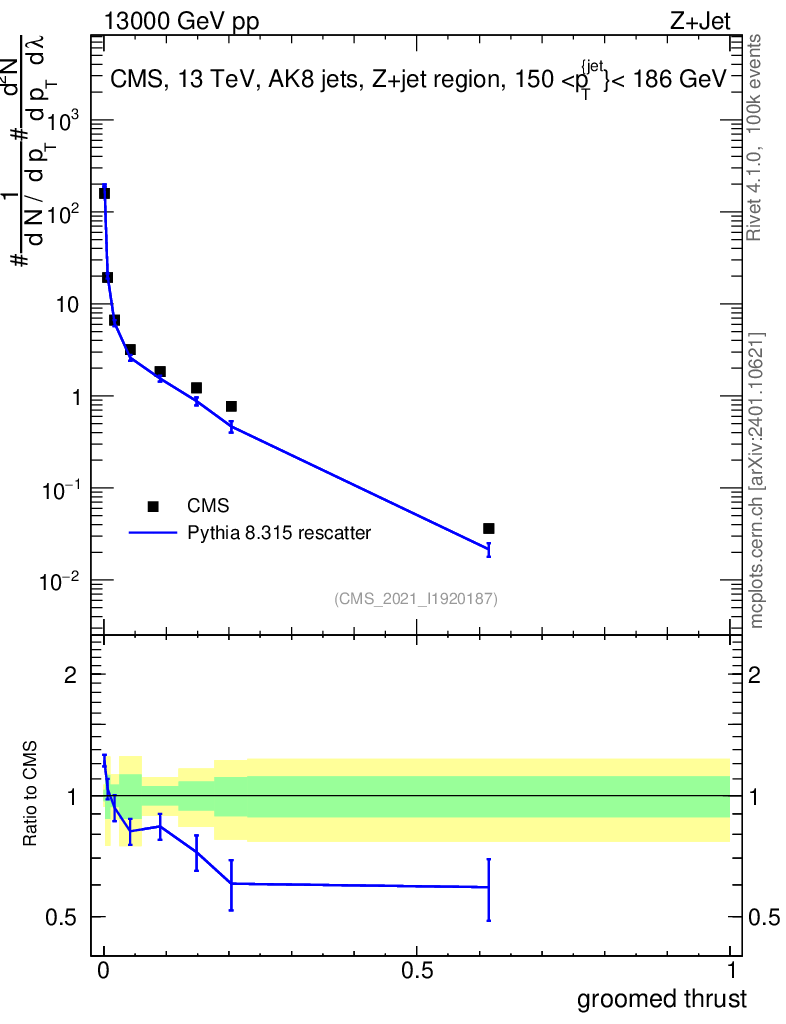 Lines: data, pythia8 8.315 rescatter |