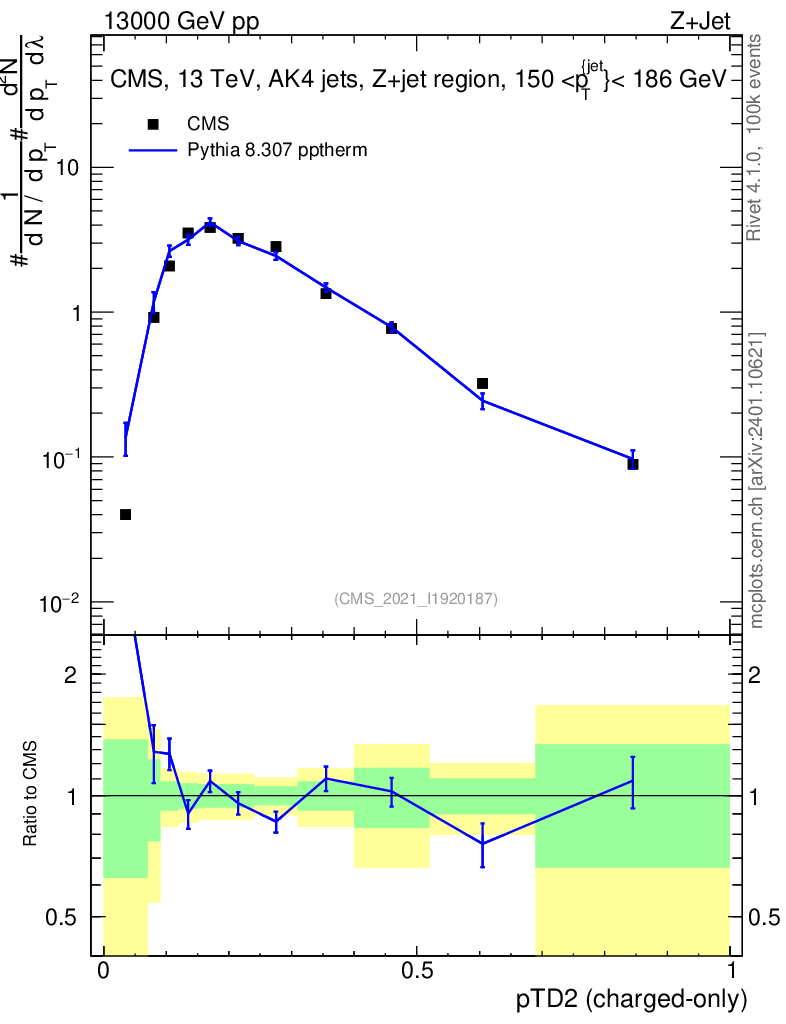 Lines: data, pythia8 8.307 pptherm |