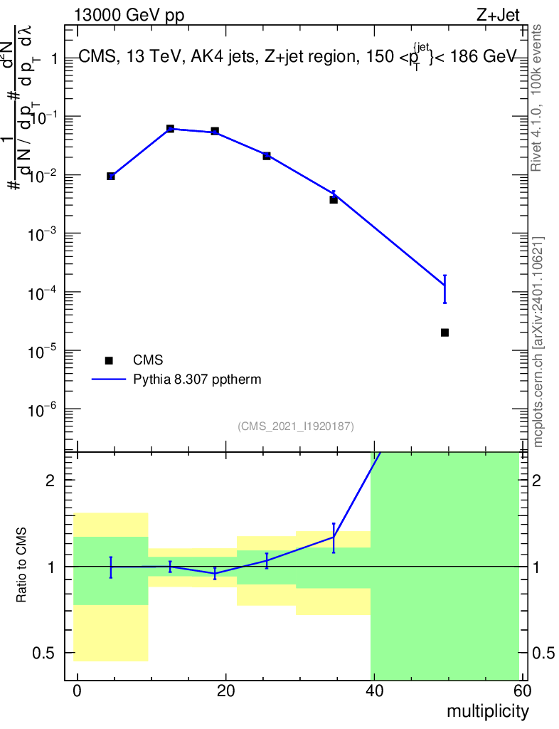 Plot of j.mult in 13000 GeV pp collisions