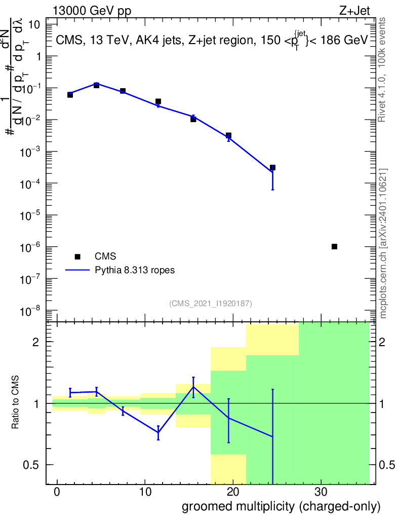 Lines: data, pythia8 8.313 ropes |