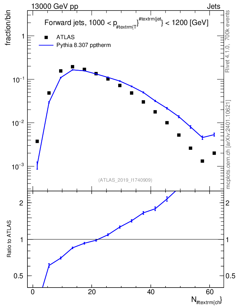 Lines: data, pythia8 8.307 pptherm |
