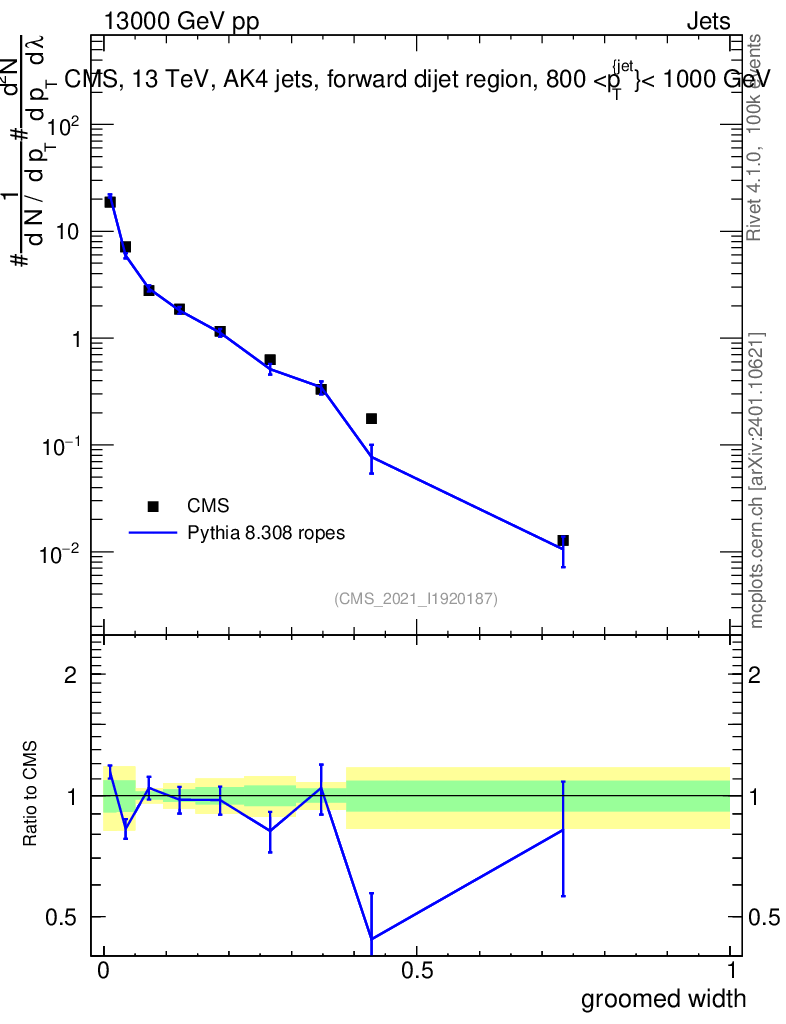 Lines: data, pythia8 8.308 ropes |