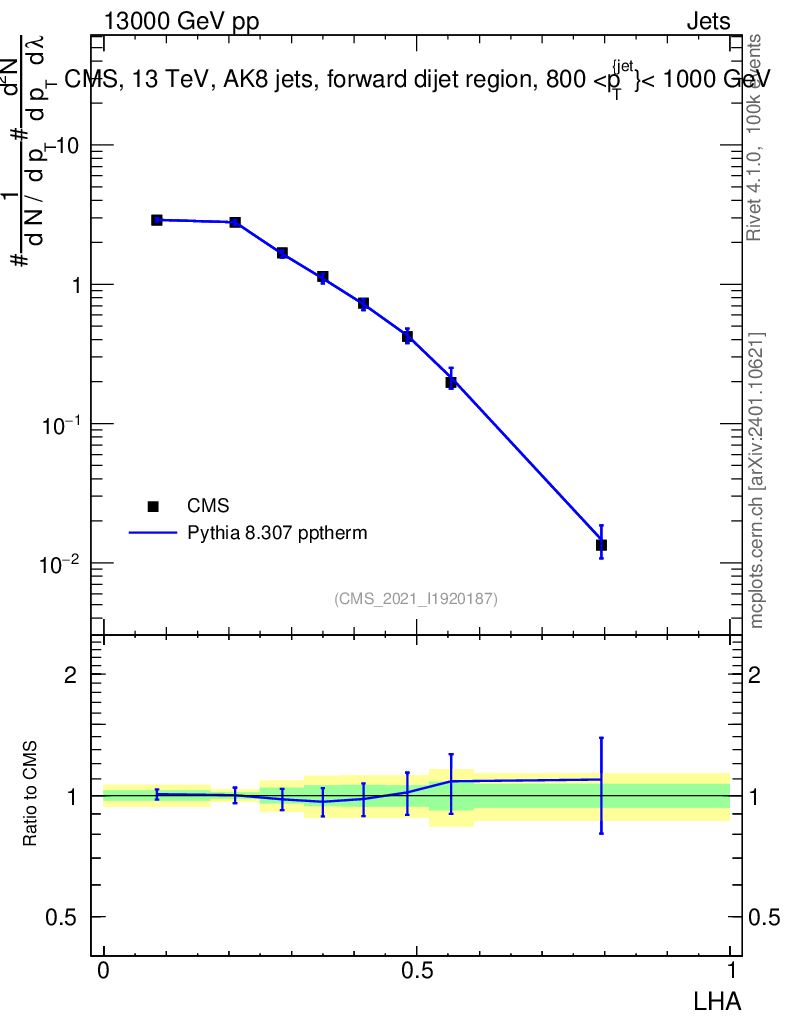 Lines: data, pythia8 8.307 pptherm |