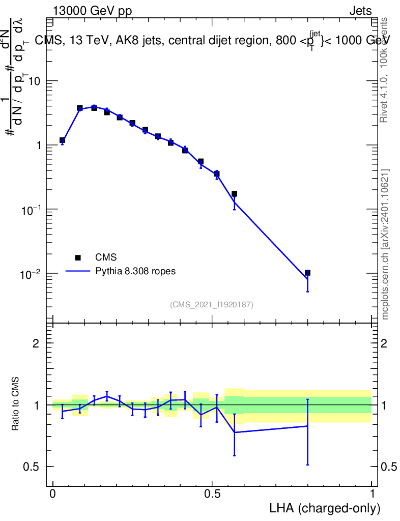 Lines: data, pythia8 8.308 ropes |