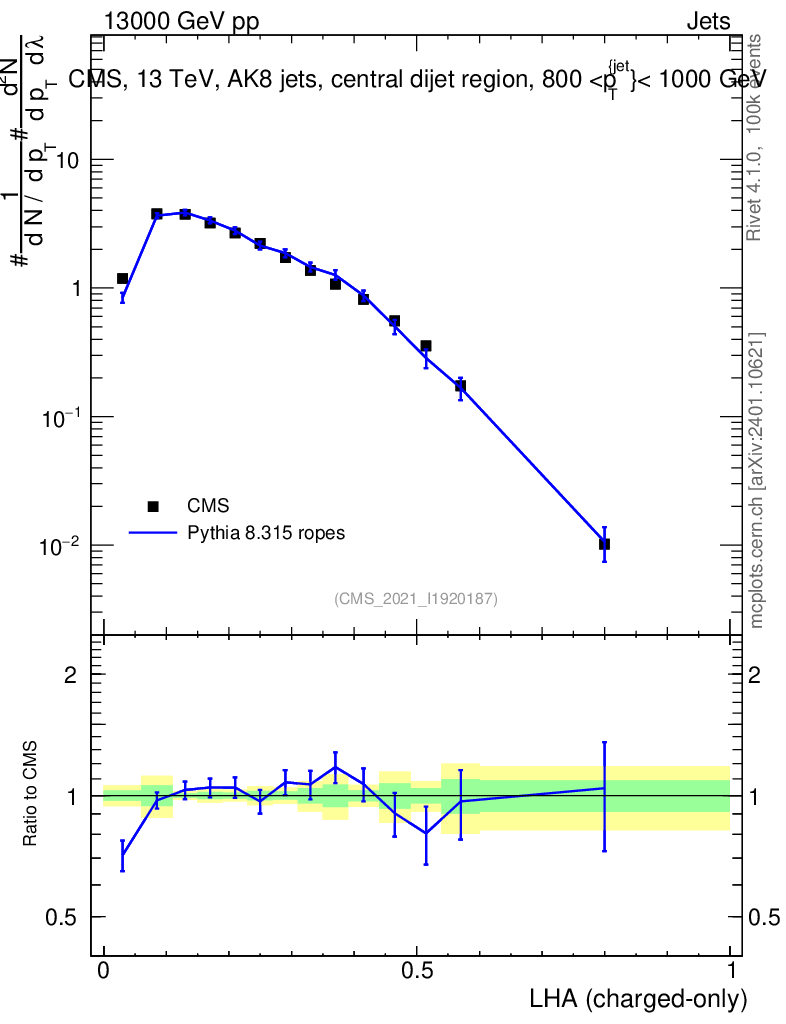 Lines: data, pythia8 8.315 ropes |