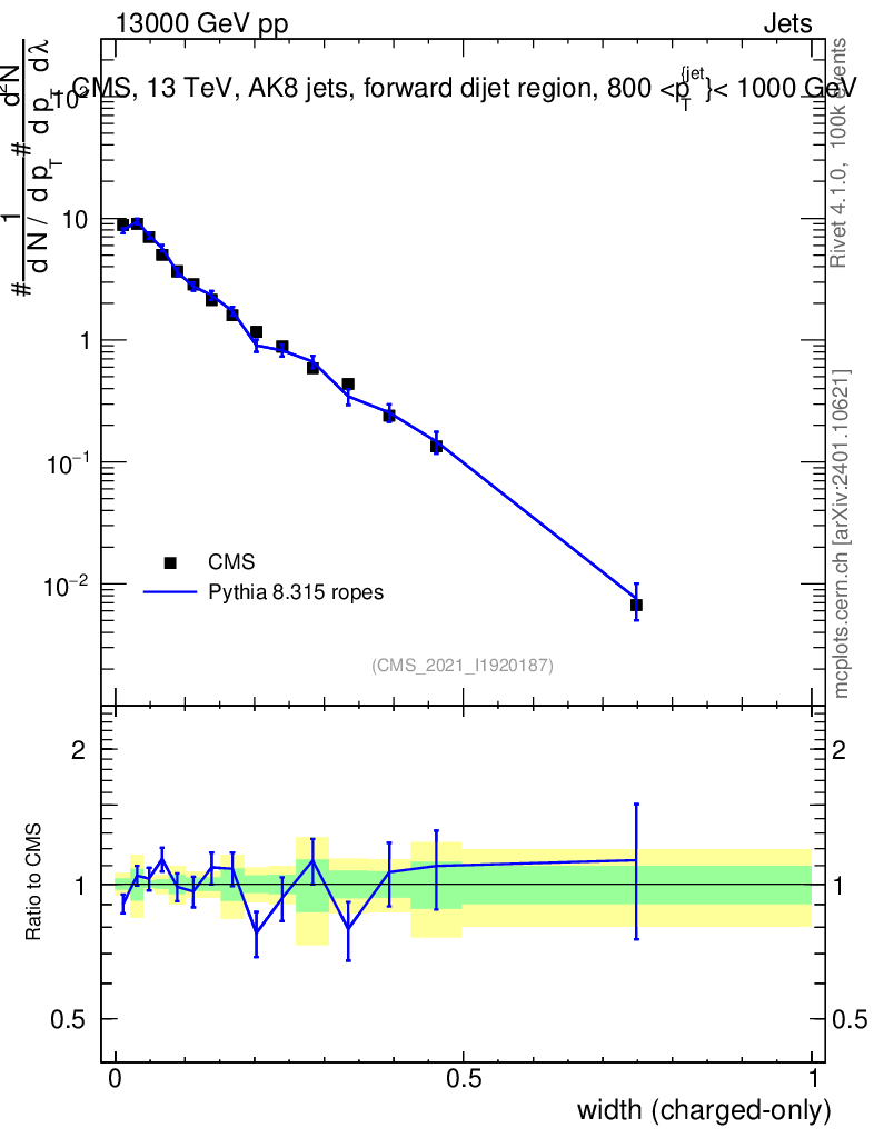 Lines: data, pythia8 8.315 ropes |