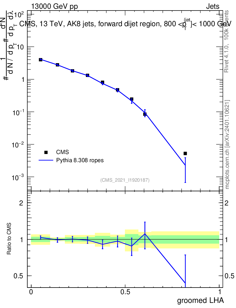 Lines: data, pythia8 8.308 ropes |