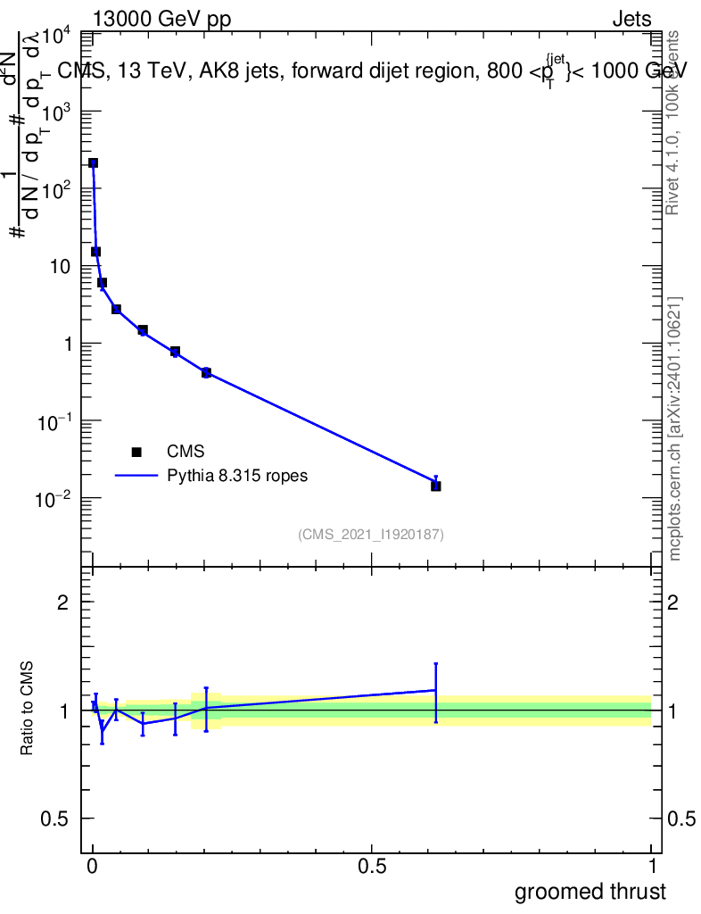 Lines: data, pythia8 8.315 ropes |