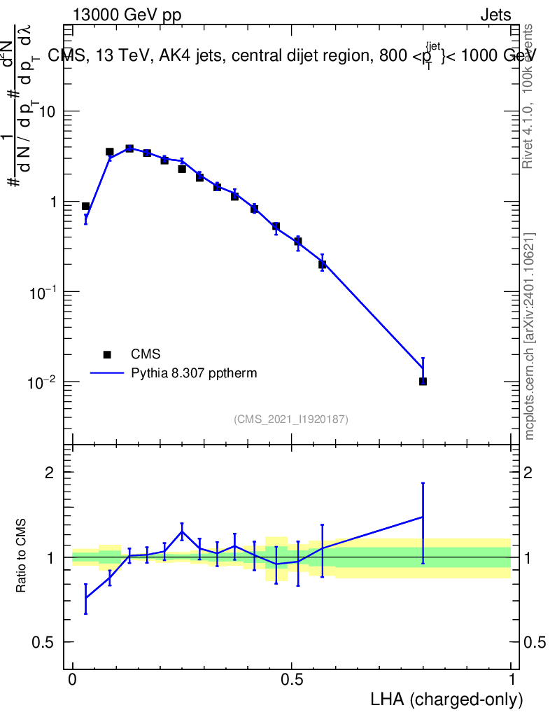 Lines: data, pythia8 8.307 pptherm |