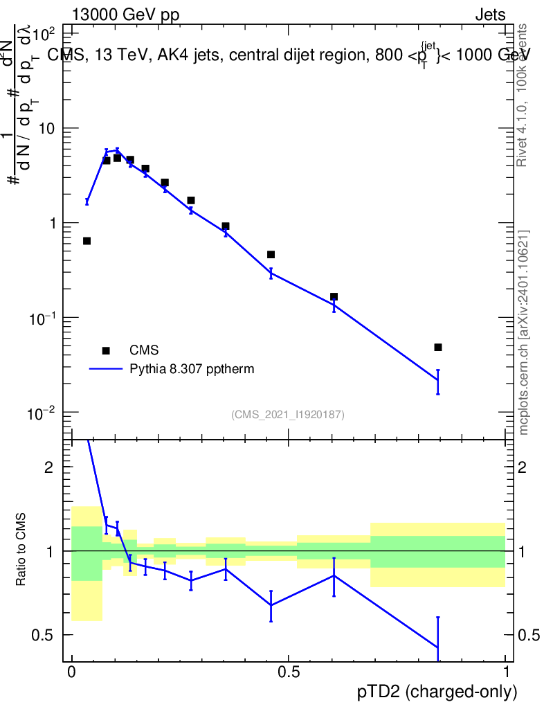 Lines: data, pythia8 8.307 pptherm |