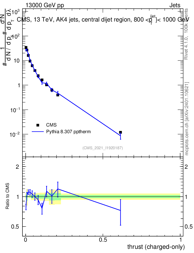 Lines: data, pythia8 8.307 pptherm |