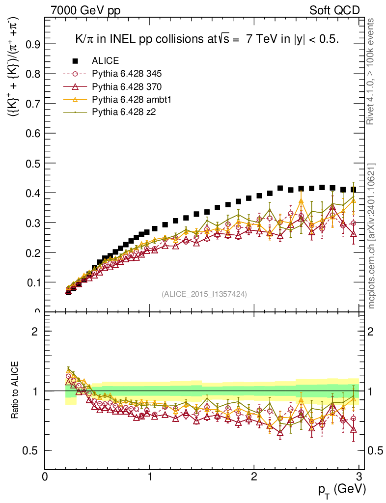 Soft QCD (inelastic) : Identified Particles : Ratios : (K-+K+)/(π-+π+) vs pT