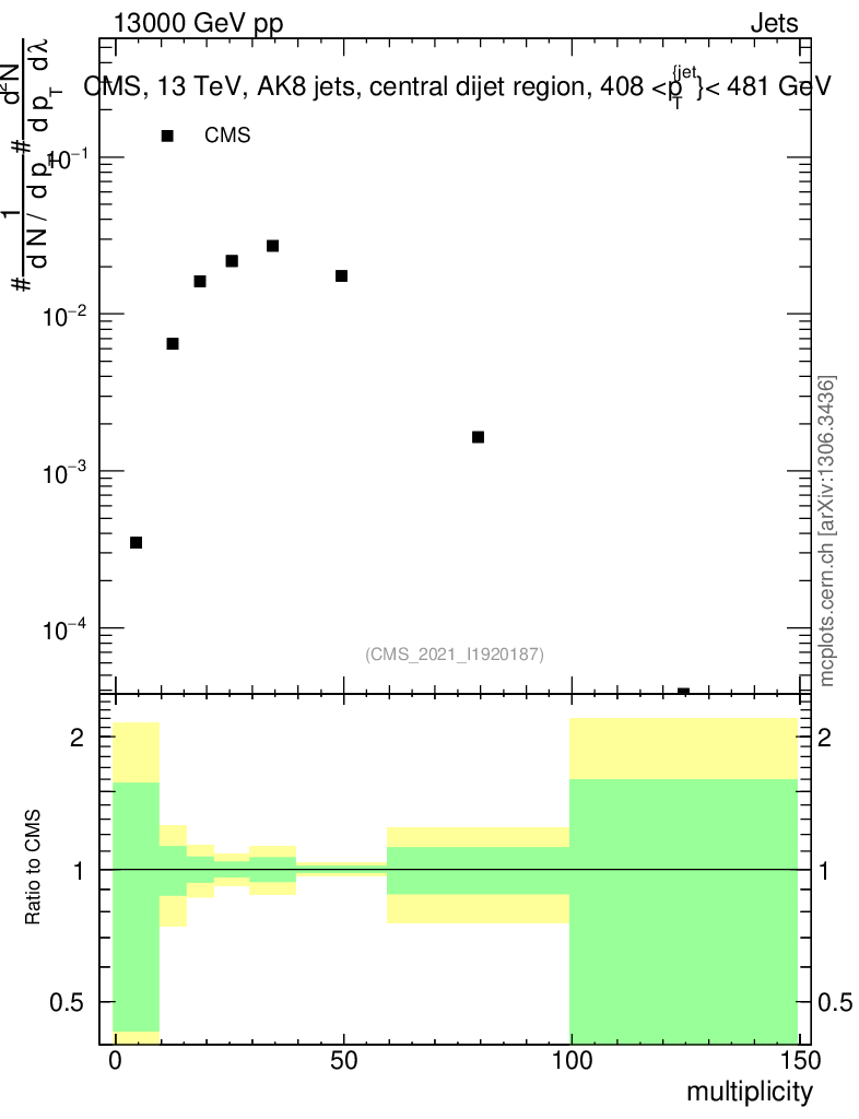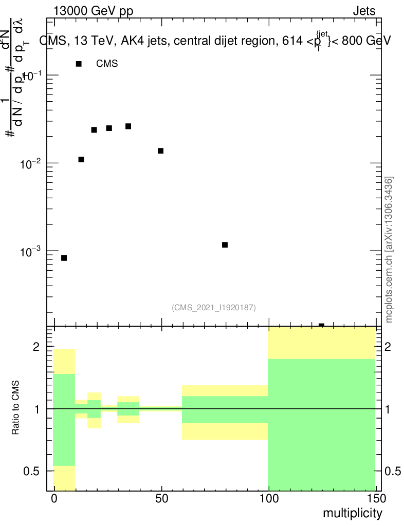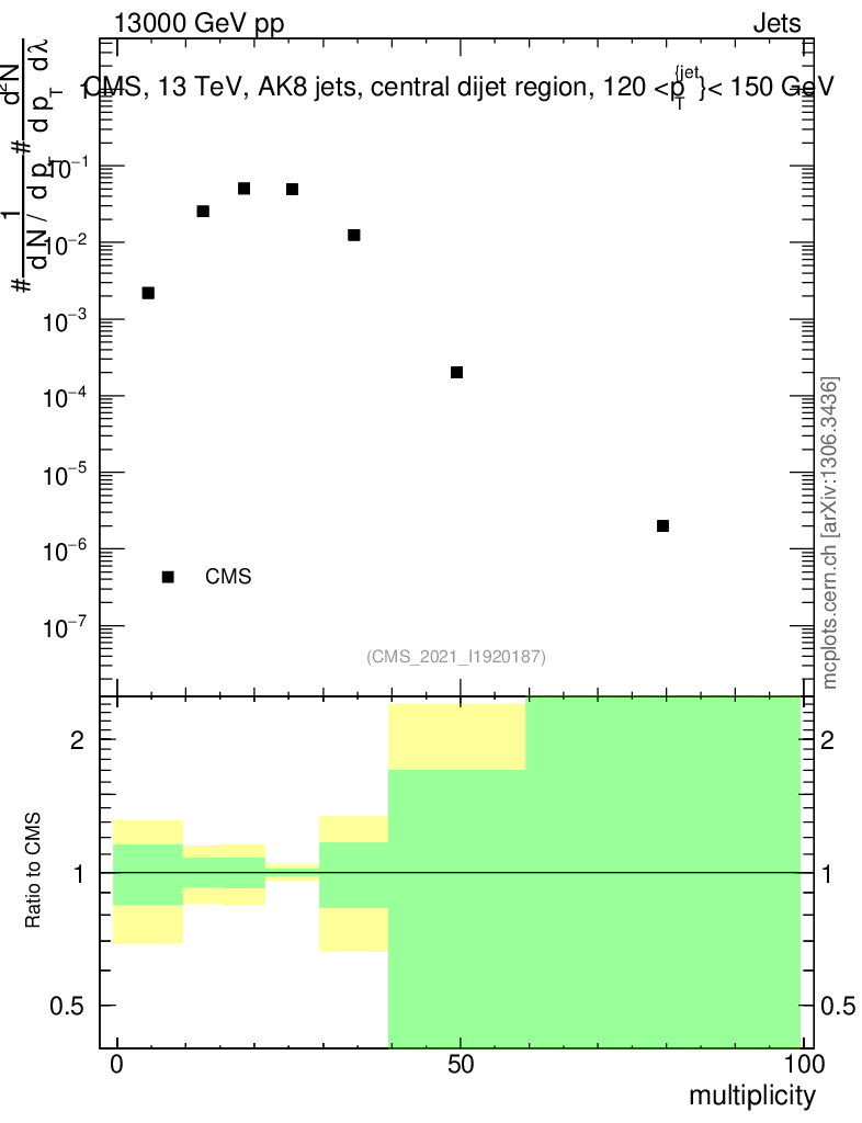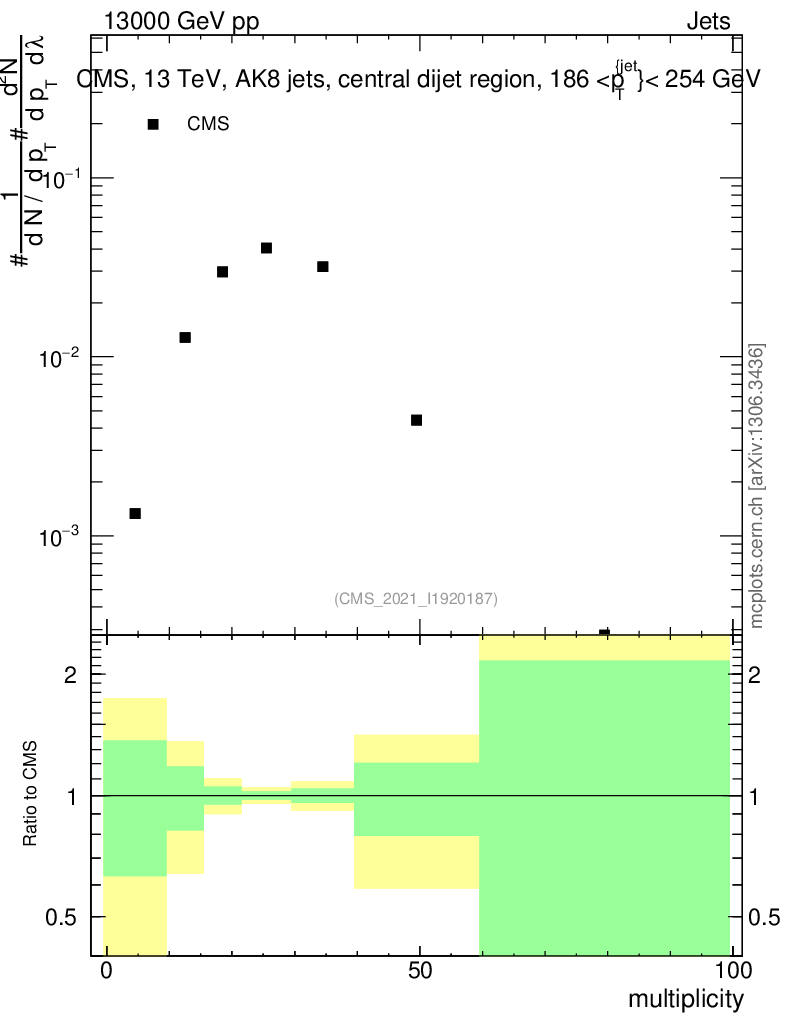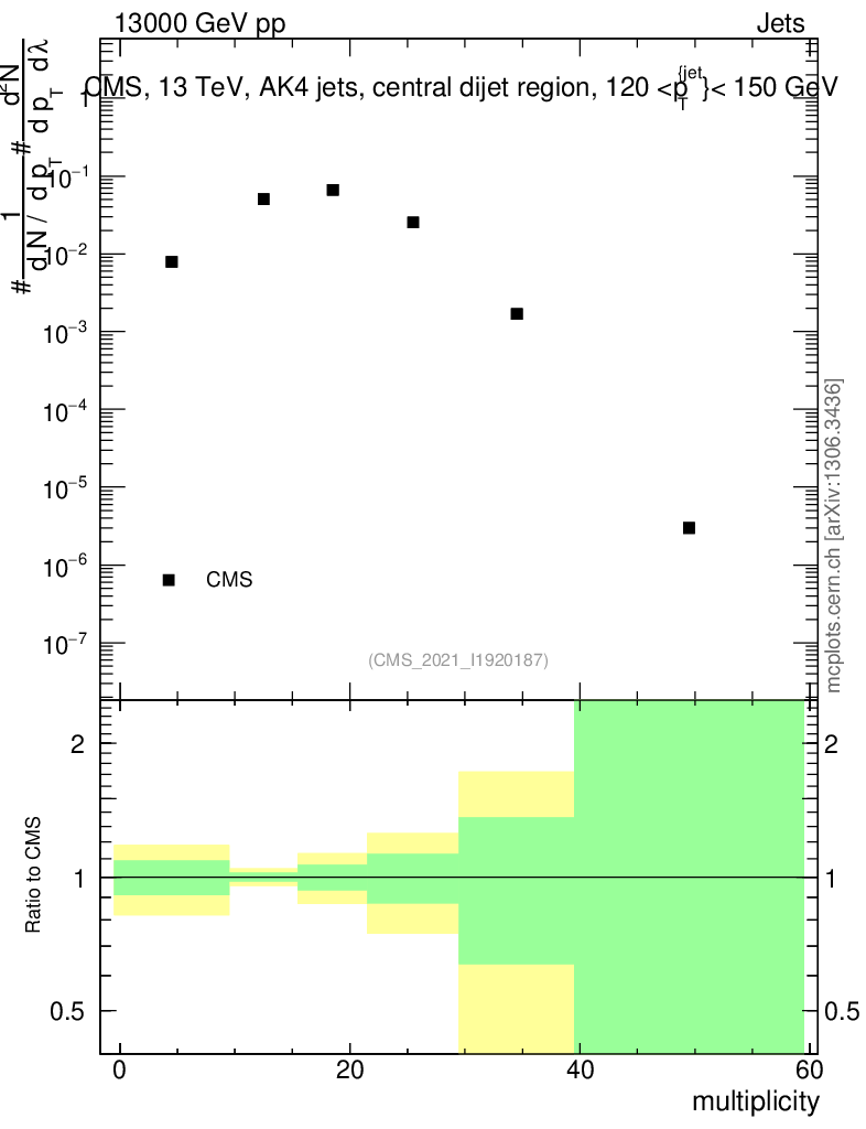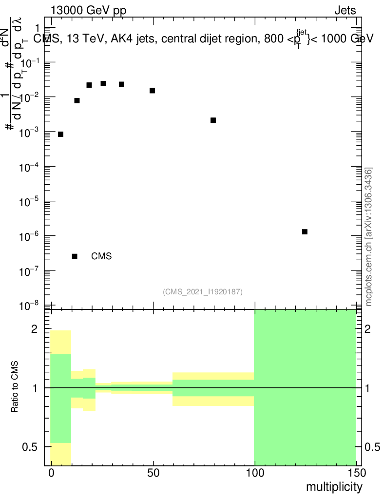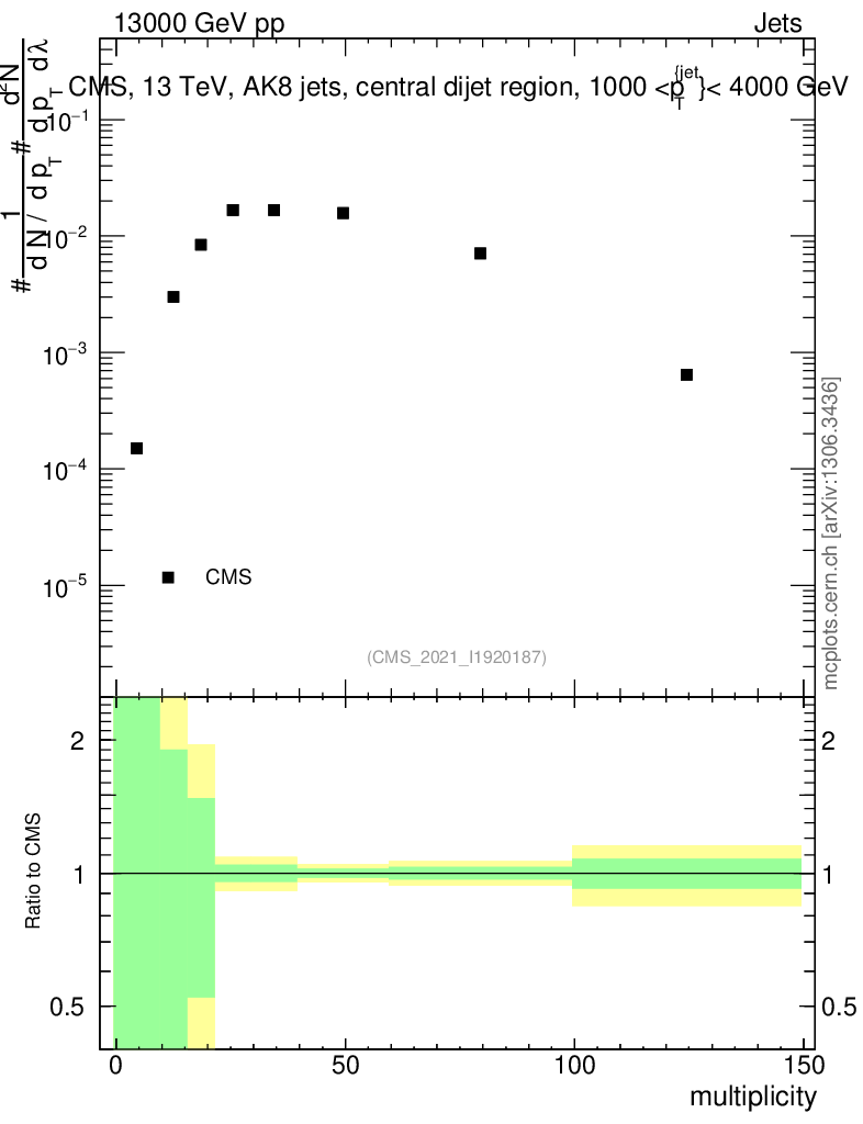 Plot of j.mult in 13000 GeV pp collisions