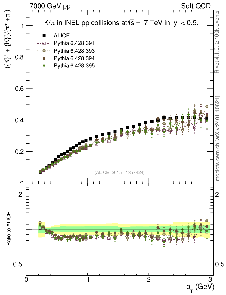 Soft QCD (inelastic) : Identified Particles : Ratios : (K-+K+)/(π-+π+) vs pT