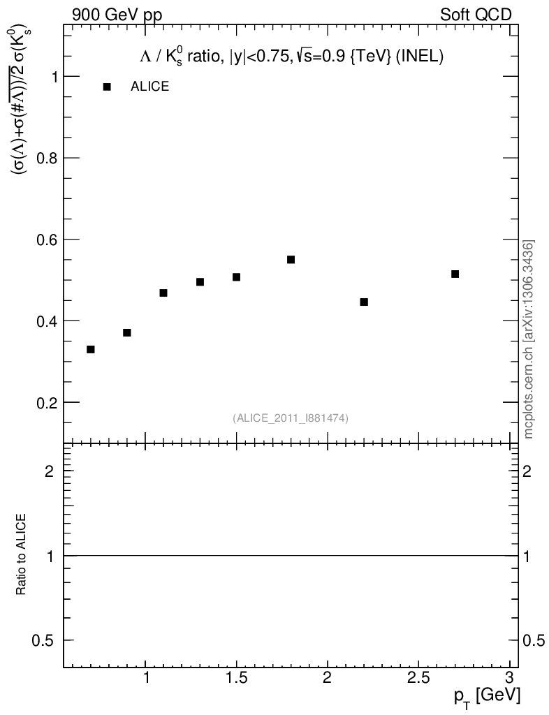 Soft QCD (inelastic) : Identified Particles : Ratios : Λ/K0S vs pT