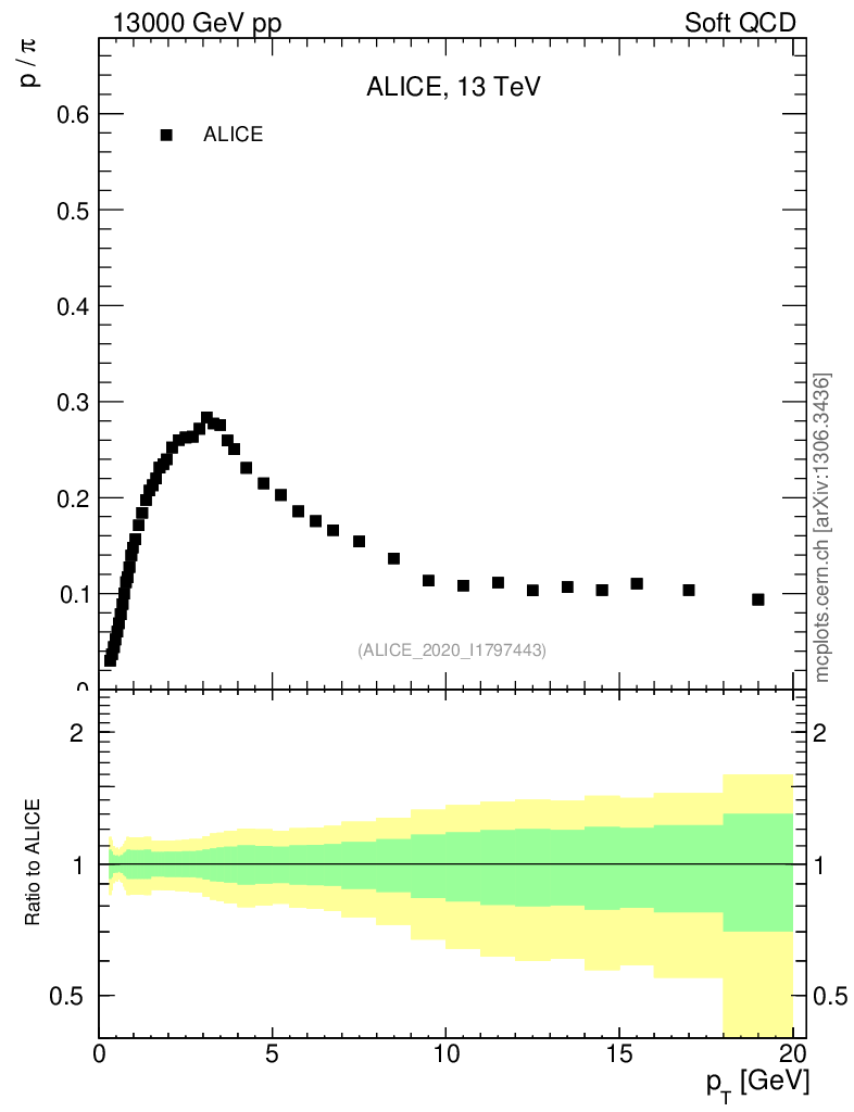 Soft QCD (inelastic) : Identified Particles : Ratios : p/π+ vs pT