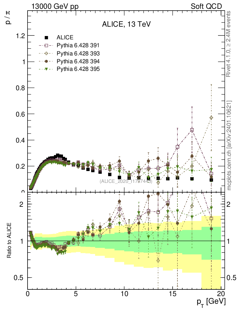 Soft QCD (inelastic) : Identified Particles : Ratios : p/π+ vs pT