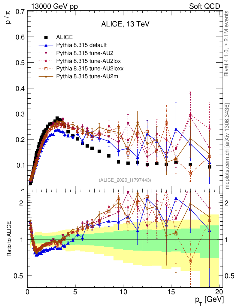 Soft QCD (inelastic) : Identified Particles : Ratios : p/π+ vs pT