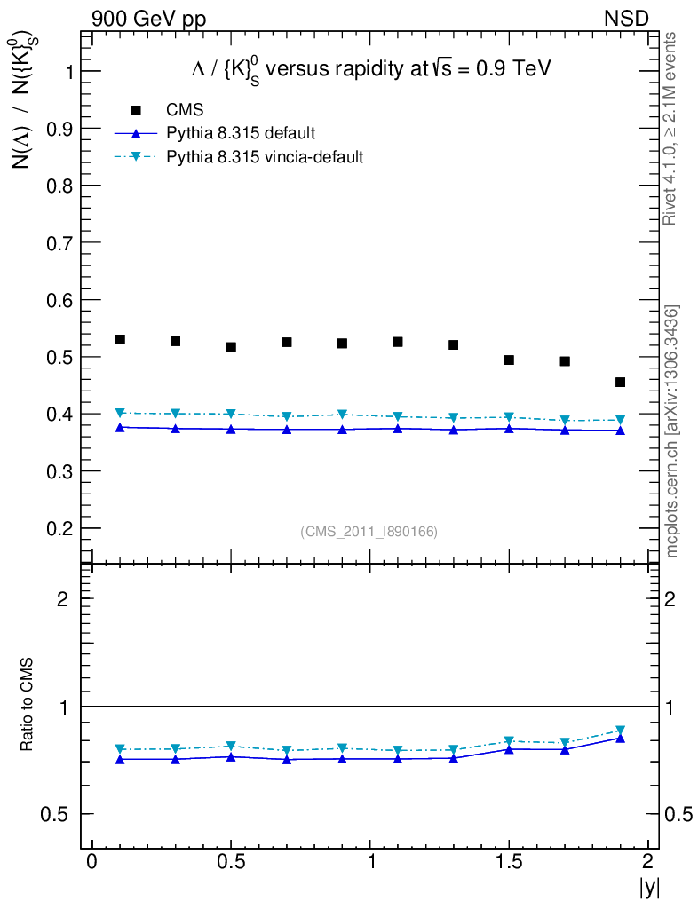 Soft QCD (nsd only) : Identified Particles : Ratios : Λ/K0S vs |y|