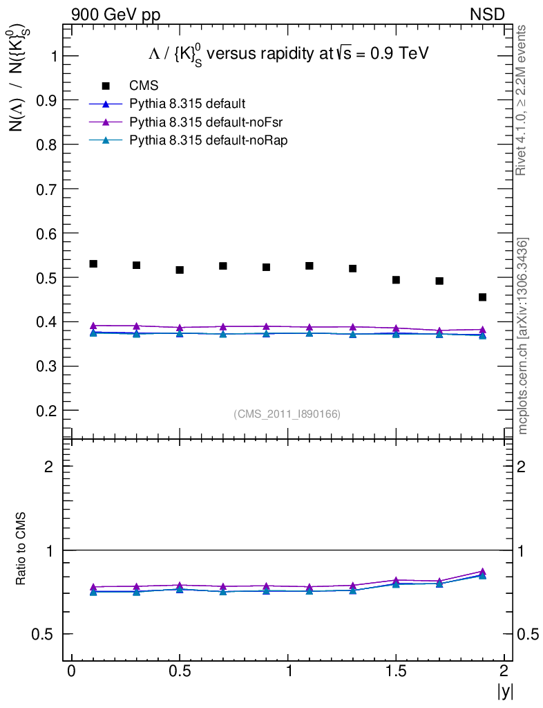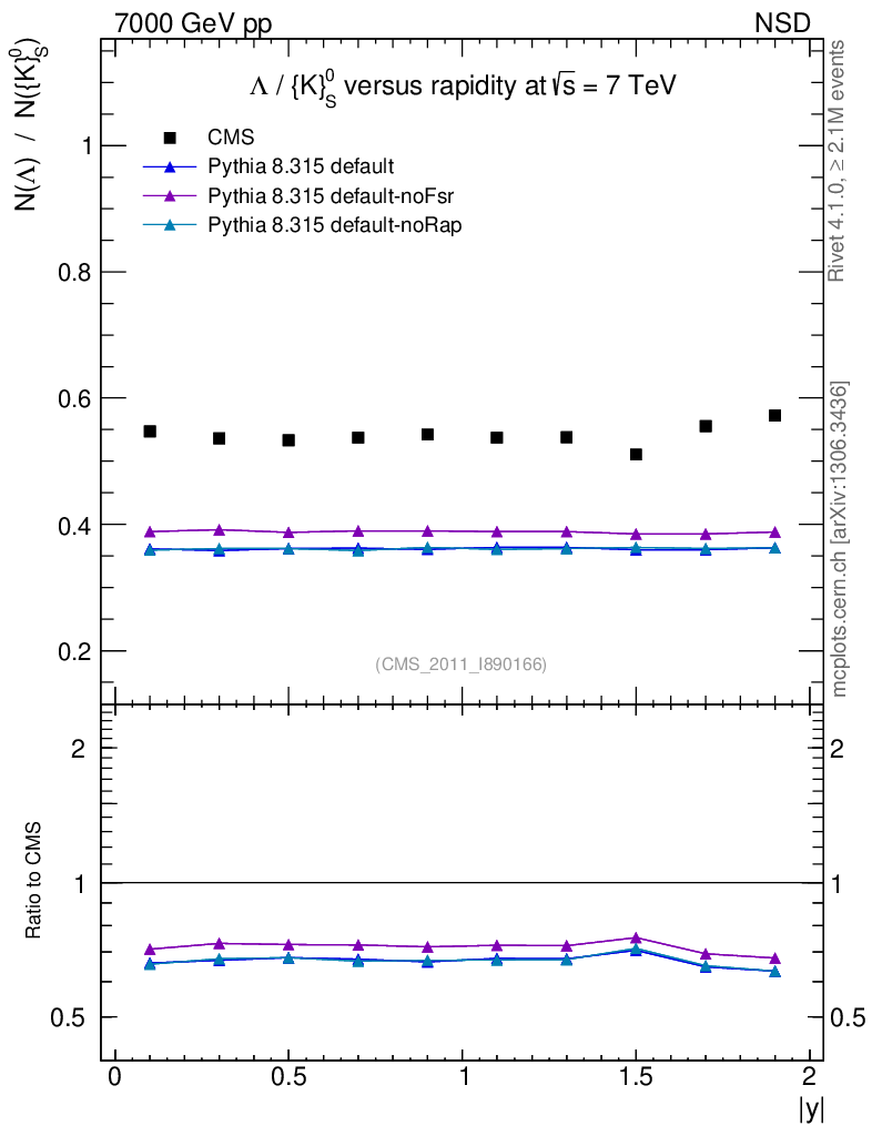 Soft QCD (nsd only) : Identified Particles : Ratios : Λ/K0S vs |y|