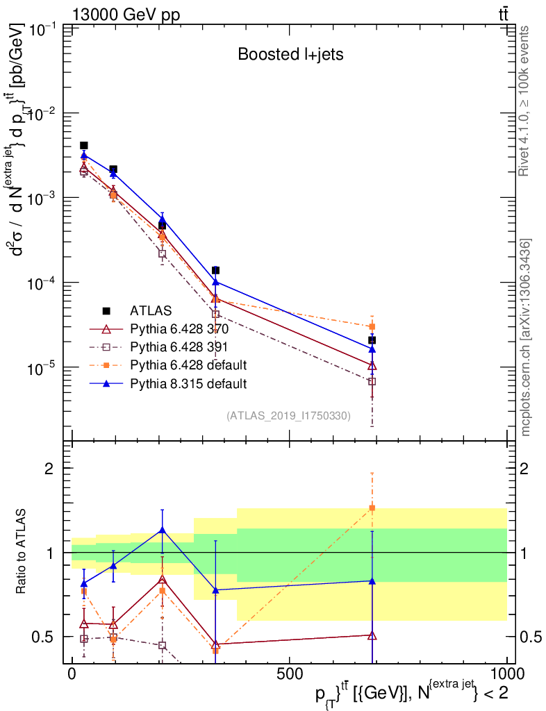 bjbj.m bjbj.pt bjt.dphi ej.pt ejej.dphi ΔR(extra jets) ejets.ht ΔR(extra, leading jet) ΔR(top, extra jet) Jet pT Lepton η Lepton pT Δφ(lepton,jet) ST(leptons, jets) nch sumpt Pouttop Top pT top.pt.ttbarRF Top rapidity topej.dphi topej.m χ(ttbar) Δφ(ttbar) Δy (ttbar) ttbar HT m(ttbar) Pcrossttbar ttbar pT ttbar.thetaStar Ttbar rapidity Mean rapidity ttbarej.ht ttbarej.m Cross sections