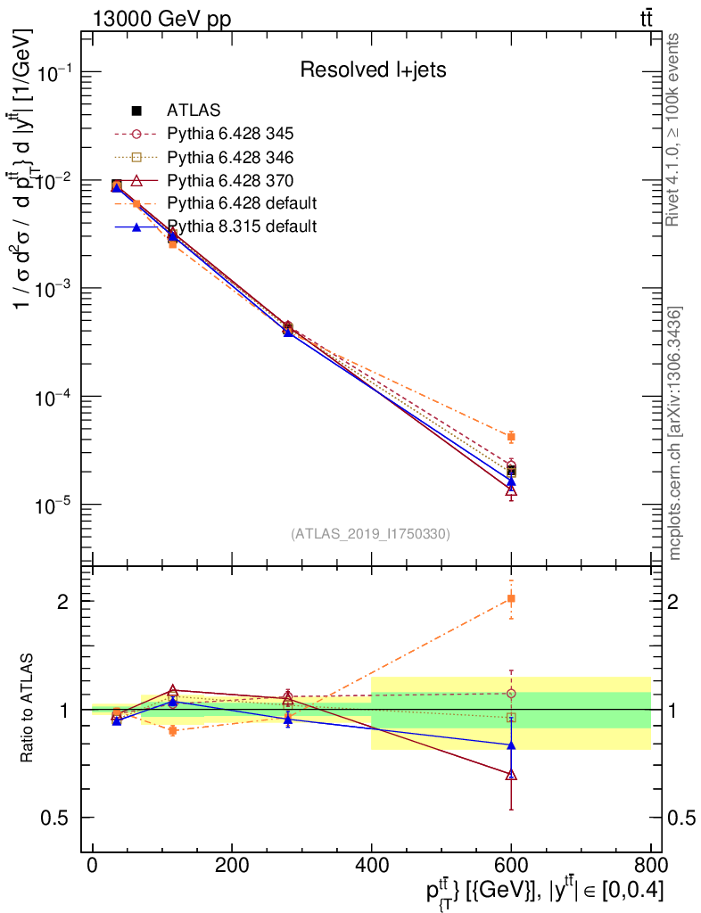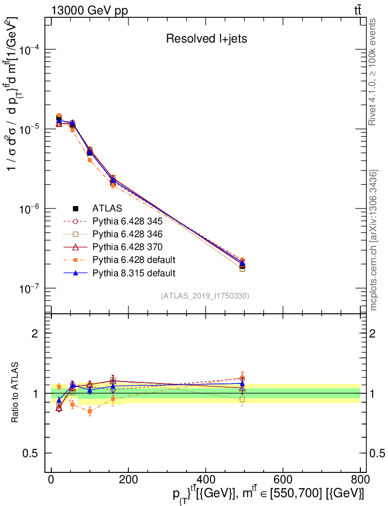 Plot of ttbar.pt in 13000 GeV pp collisions