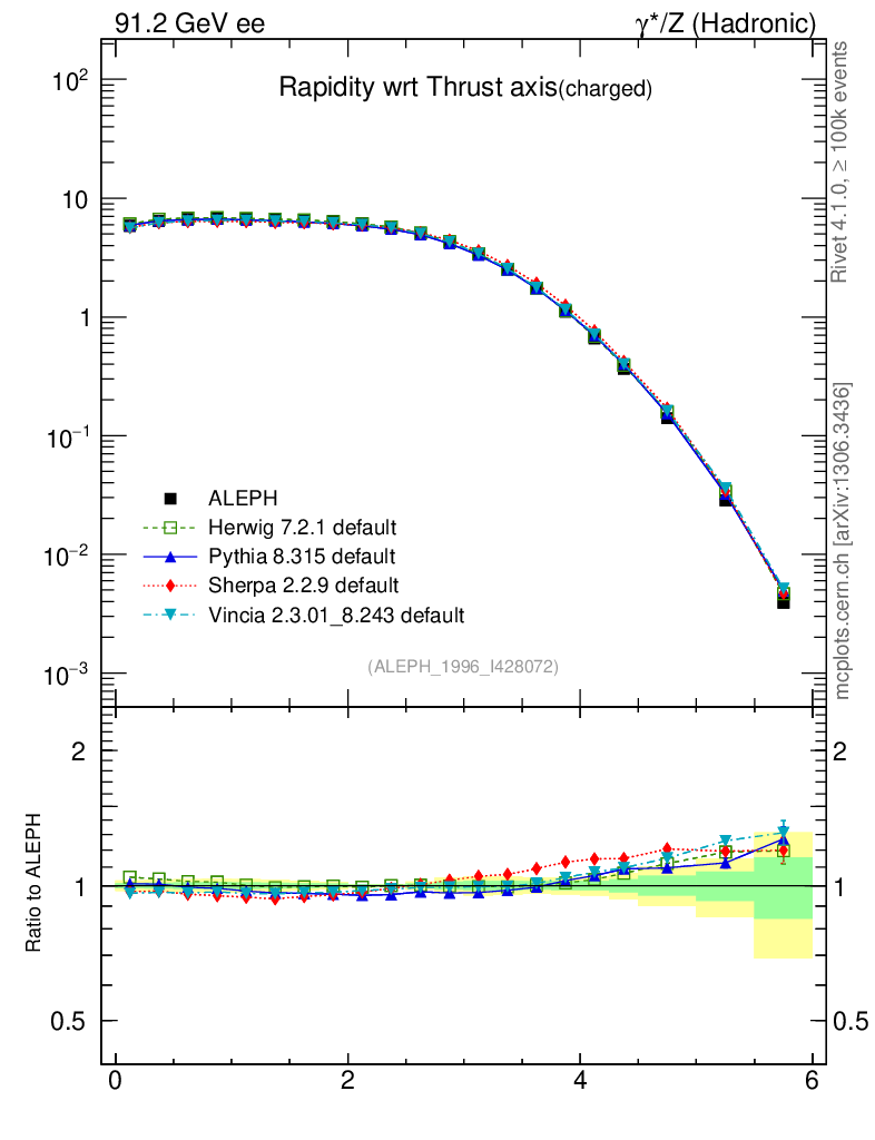 ee : γ*/Z (hadronic) : Charged Particles : Rapidity wrt Thrust axis